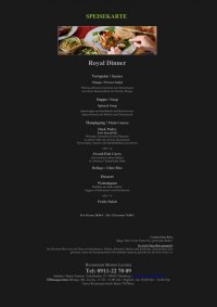 SPEISEKARTE Royal Dinner Vorspeise / Starter Mango / Prawn Salad Würzig gebratene Garnelen mit Zitronengras auf einem Bananenblatt mit frischer Mango Suppe / Soup Spinach Soup Spinatsuppe mit Knoblauch und Kokoscreme, abgeschmeckt mit Muskat und Zitronensaft Hauptgang / Main Course Duck Padre Ente Spezialität Würziges Entenfleisch mit Pflaumen in grüner Soße mit Arrack, Kardamom, Zitronengras, Ingwer und Rampeblättern geschmort oder / or Sword-Fish Curry Schwertfisch (ohne Gräten) in schwarzer Tamarinden-Soße Beilage : Ghee Rice Dessert Wattalapam Pudding aus Kokosmilch, Jaggery (Palmzucker) und Kardamom oder / or Fruits Salad Pro Person 38,00 € / für 2 Personen 70,00 € Ceylon Ghee Reis: Ghee: Ghee ist der Name für „gereinigte Butter“ So wird Ghee-Reis gemacht: Der Basmati Reis wird im Ghee mit Kardamom, Nelken, Kümmel, Muskat und Kurkuma, Zitronengras kurz gebraten, dann mit hausgemachter Fleischbrühe langsam gekocht bis der Reis weich ist. Restaurant Mount Lavinia Tel: 0911-22 70 09 Inhaber: Shane Samson | Jakobsplatz 22 | 90402 Nürnberg | www.MountLavinia.de Öffnungszeiten Mittags: Mo. bis Sa., 11.30 - 15.00 Uhr | Täglich: von 18.00 Uhr - 24.00 Uhr Unser Restaurant bietet Ihnen 70 Plätze.